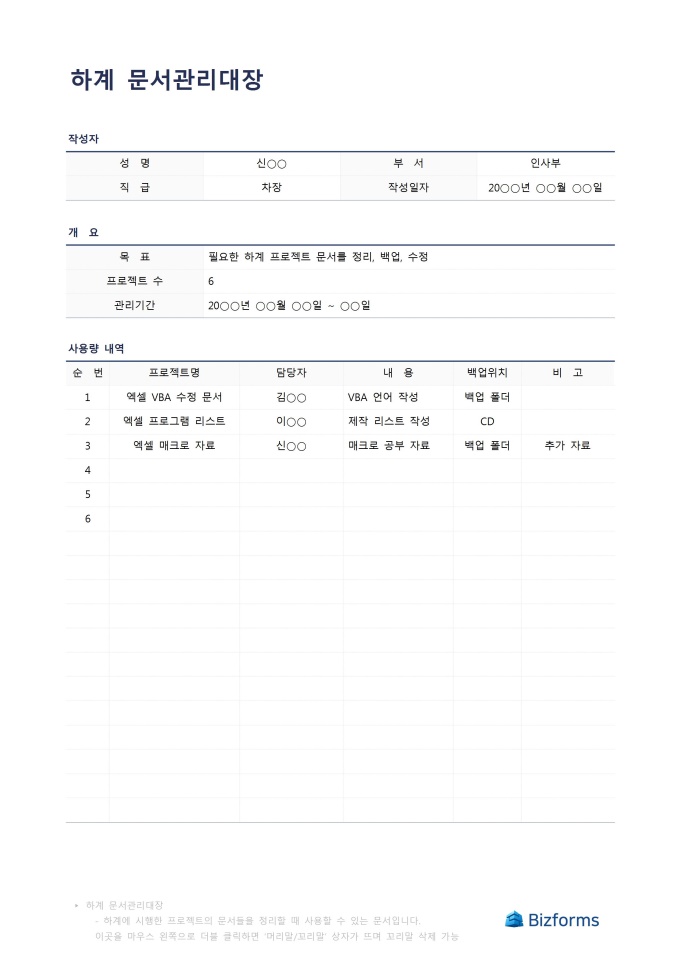 하계문서관리대장입니다. 하계 프로젝트에 사용했던 문서들을 작성할 때 사용할 수 있는 문서입니다.