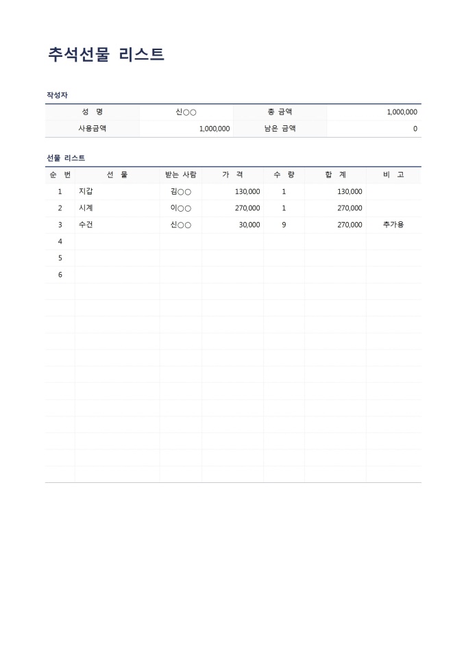 9,000원/월추석선물리스트입니다. 추석에 나눠줄 선물 리스트를 작성할 때 사용할 수 있는 문서입니다.