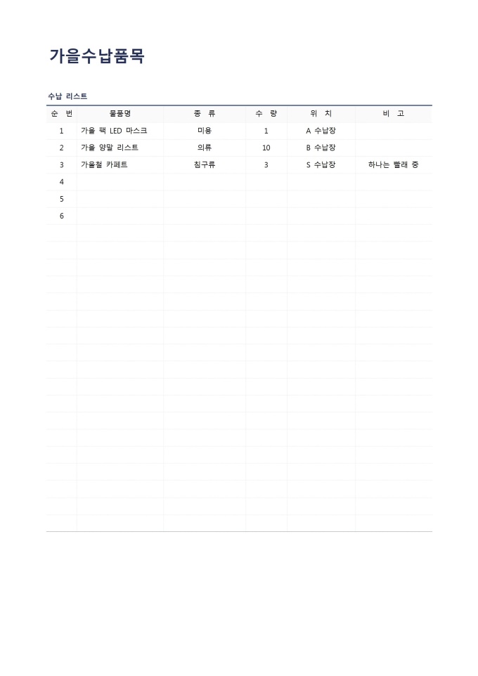 가을수납품목입니다. 가을에 수납할 품목을 작성할 때 사용할 수 있는 문서입니다.