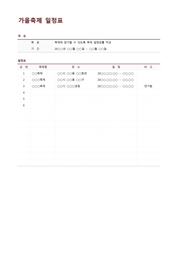 9,000원/월가을축제일정표입니다. 가을에 진행하는 축제의 일정표를 작성할 때 할 수 있는 문서입니다.