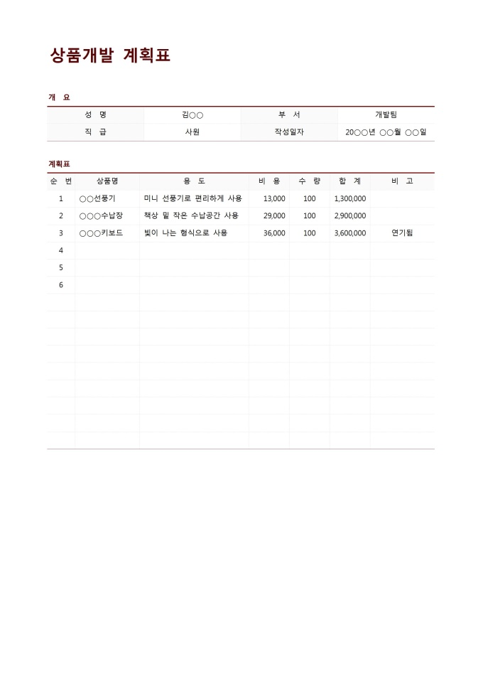 9,000원/월상품개발계획표입니다. 상품을 개발할 때 계획표를 작성할 때 사용할 수 있는 문서입니다.