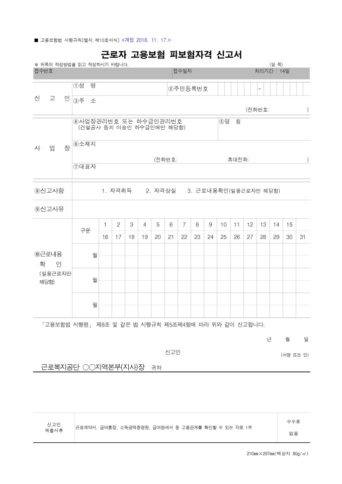 9,000원/월근로자의 고용보험 피보험자격을 신고할 때 작성하는 신고서 양식입니다.