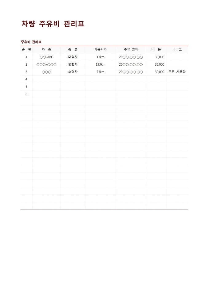 9,000원/월차량주유비관리표입니다. 차량의 주유한 내역을 작성할 때 사용할 수 있는 문서입니다.