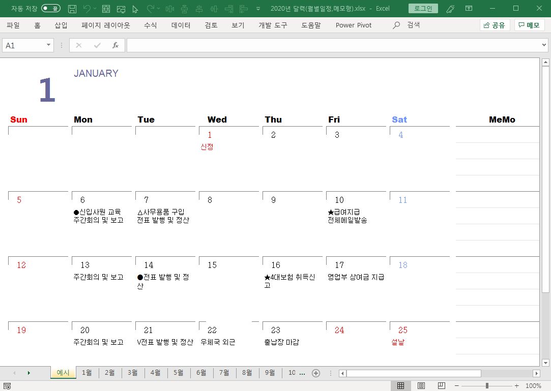 2020년 달력입니다. 모던한 디자인으로 월별일정을 관리하실수 있으시며 메모란을 추가하여 간단한 메모도 가능하도록 제작하였습니다.