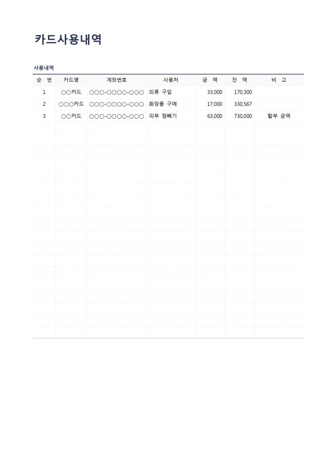 카드사용내역입니다. 카드를 사용한 내역을 작성할 때 사용할 수 있는 문서입니다.