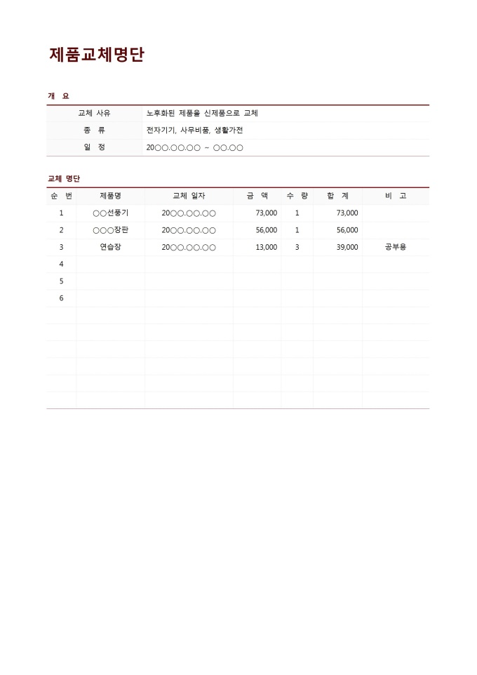제품교체명단입니다. 제품을 교체할 명단을 작성할 때 할 수 있는 문서입니다.