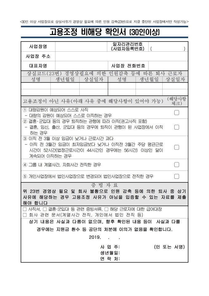 고용조정 비해당 확인서[30인이상]