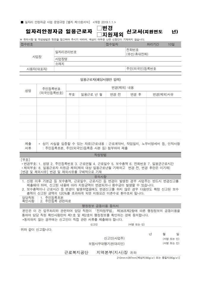 일자리안정자금 일용근로자 변경(지원제외) 신고서
