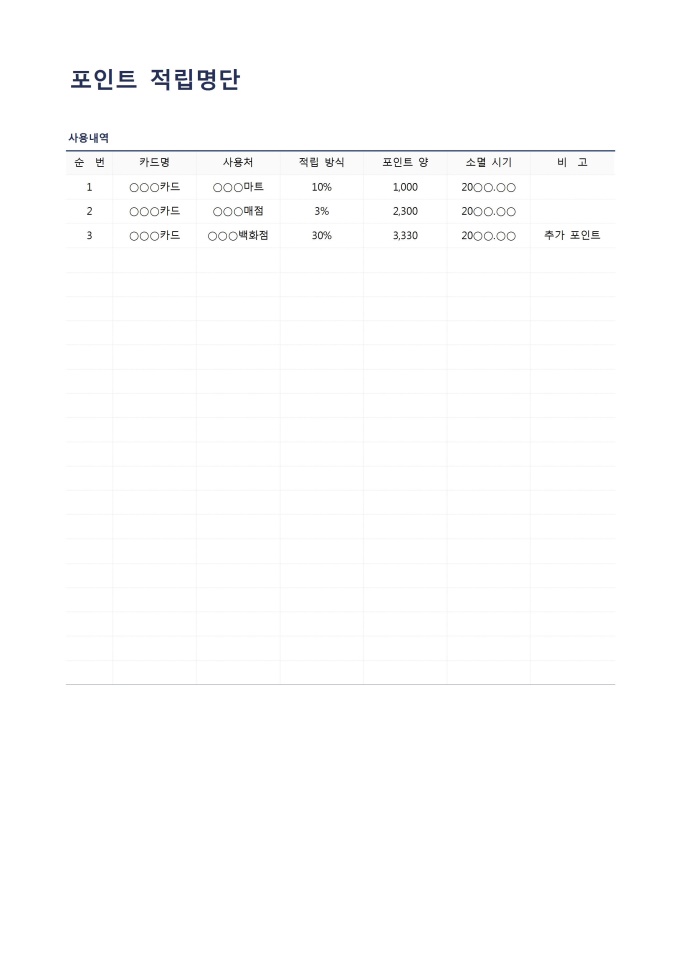 9,000원/월포인트적립명단입니다. 카드별로 적립된 포인트 내역을 작성할 때 사용할 수 있는 문서입니다.