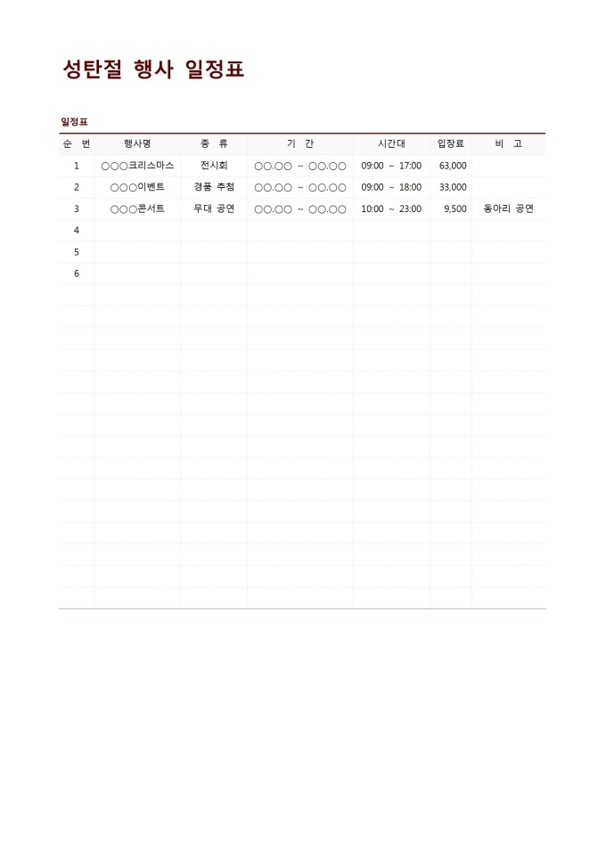 9,000원/월성탄절행사일정표입니다. 성탄절에 진행하는 행사 일정표를 작성할 때 사용할 수 있는 문서입니다.