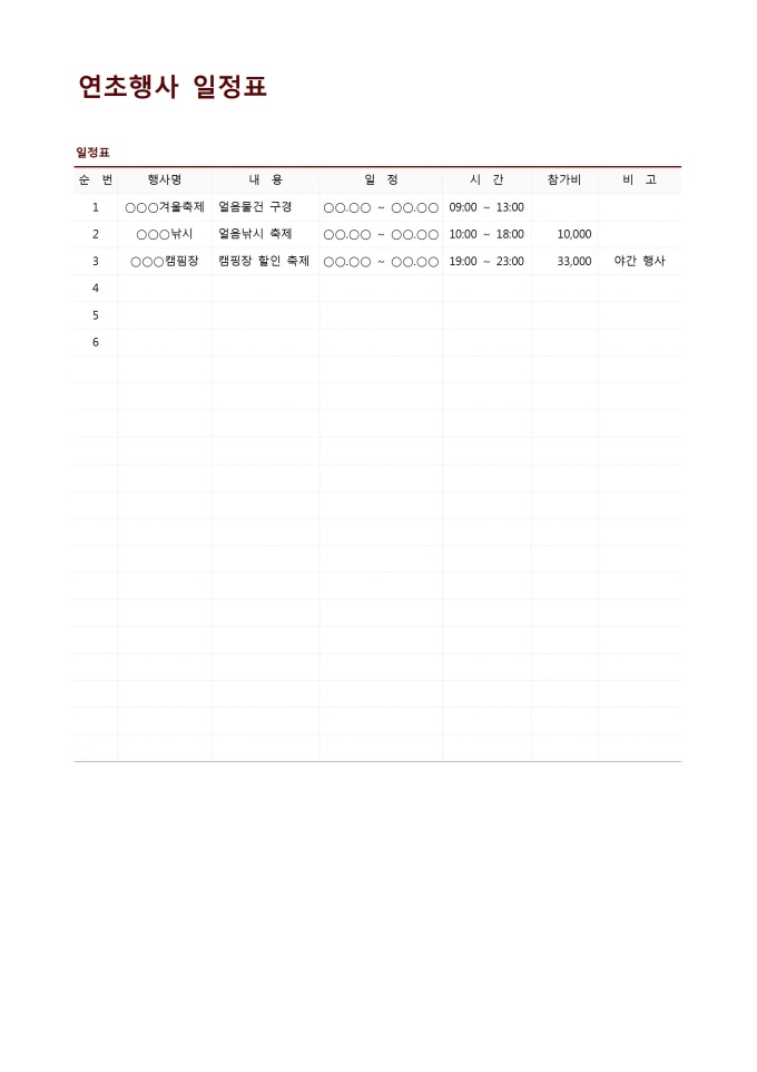 연초행사 일정표입니다. 연초에 진행하는 행사들의 일정표를 작성할 때 사용할 수 있는 문서입니다.