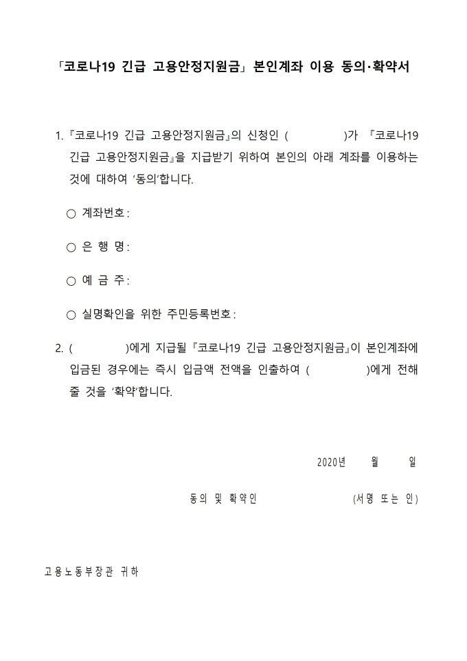 코로나 19 사태로 긴급 고용안정 지원금을 본인계좌로 이용하는 것에 대한 동의서를 작성하여 신청할 때 사용합니다.