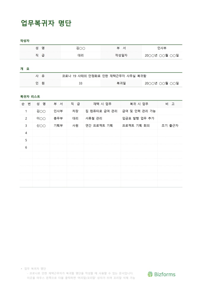 업무복귀자명단입니다. 코로나 이후 재택 근무자들이 사무실로 업무 복귀 하는 명단을 작성할 때 사용할 수 있는 문서입니다.