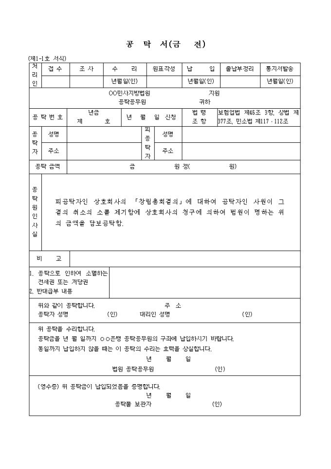 9,000원/월(제1-1호 서식) 상호회사창립총회결의취소의소제기의손해보증공탁서 입니다. 피공탁자인 상호회사의 「창립총회결의」에 대하여 공탁자인 사원이 그 결의 취소의 소를 제기함에 상호회사의 청구에 의하여 법원이 명하는 위의 금액을 담보공탁함. ...