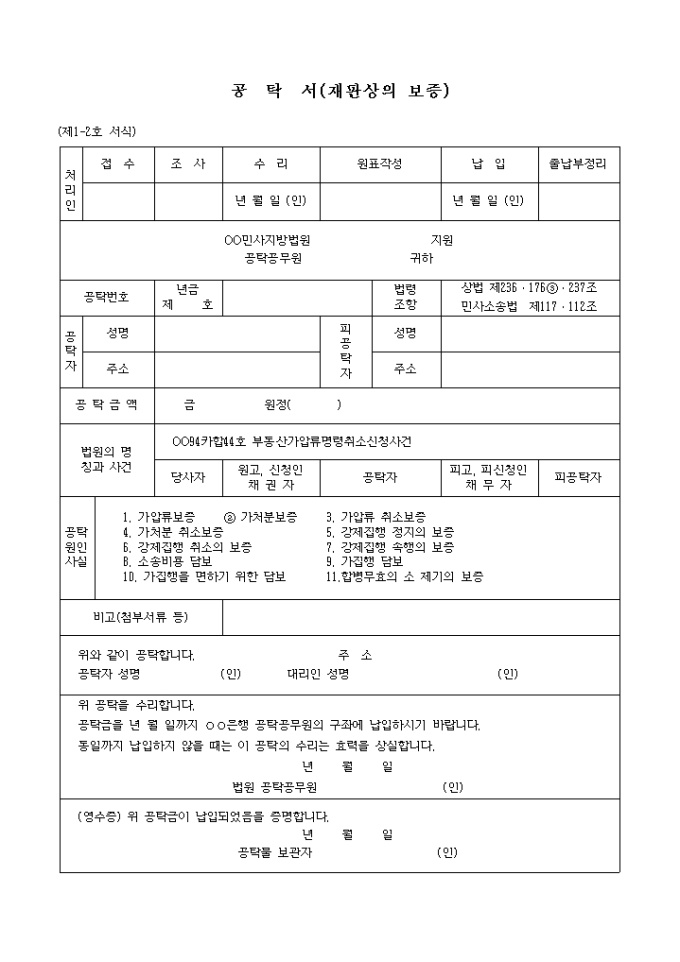 9,000원/월(제1-2호 서식) 합병무효의소제기의보증공탁서 입니다. OO94카합44호 부동산가압류명령취소신청사건 1. 가압류보증 2. 가처분보증 3. 가압류 취소보증 4. 가처분 취소보증 5. 강제집행 정지의 보증 6. 강제집행 취소의 보증 7. 강제집행 속행의 보증 8. 소송비용 담보 9. 가집행 담보 10. 가집행을 면하기 위한 담보