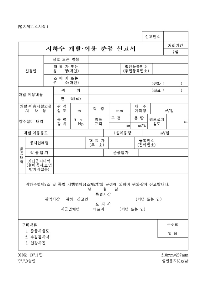 9,000원/월지하수법제9조 및 동법 시행령제14조제2항의 규정에 의하여 신고할 때 쓰이는 "지하수 개발,이용 준공신고서" 양식입니다.