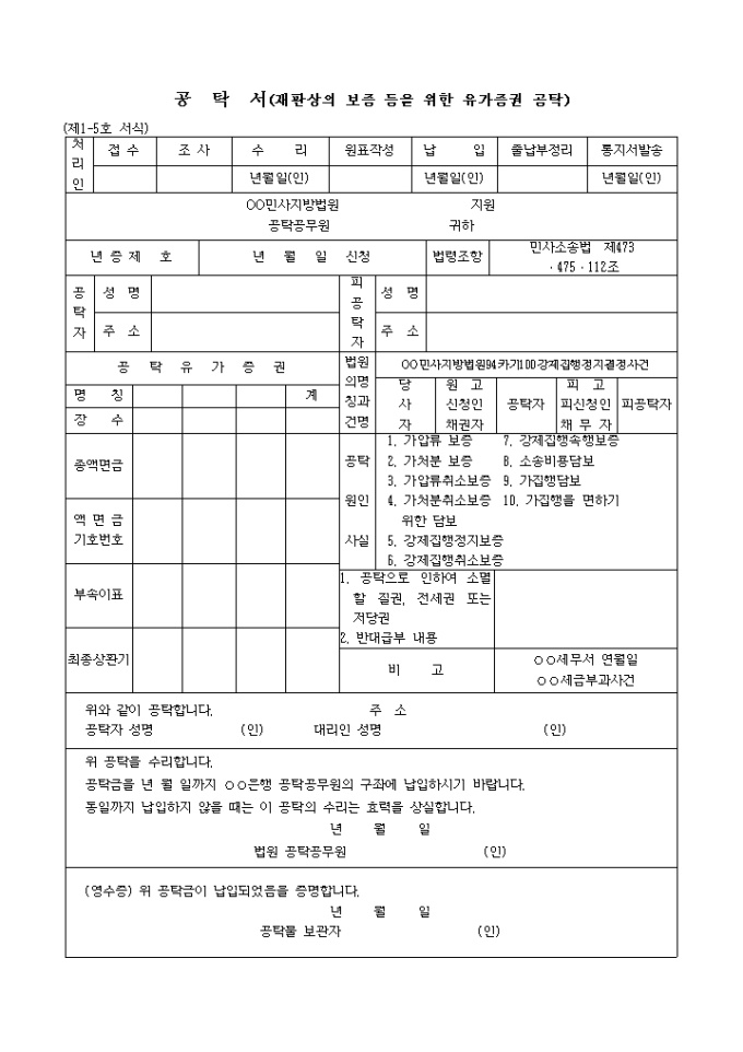 9,000원/월(제1-5호 서식) 재심시의강제집행속행의보증공탁서 입니다. 1. 공탁으로 인하여 소멸 할 질권, 전세권 또는 저당권 2. 반대급부 내용 1. 가압류보증 2. 가처분보증 3. 가압류 취소보증 4. 가처분 취소보증 5. 강제집행 정지의 보증 6. 강제집행 취소의 보증 7. 강제집행 속행의 보증 8. 소송비용 담보 9. 가집행 담보 10. 가집행을 면하기 위한 담보