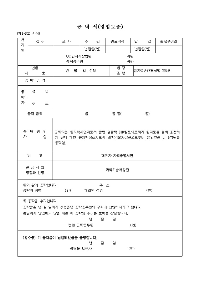 9,000원/월(제1-3호 서식) 원자력사업을 위한 손해배상조치에따른보증공탁서 입니다. 공탁자는 원자력사업자로서 금번 열출력 200킬로와트짜리 원자로를 설치 운전하게 된데 대한 손해배상조치로서 과학기술처장관으로 부터 승인받은 금 5억원을 공탁함. ..