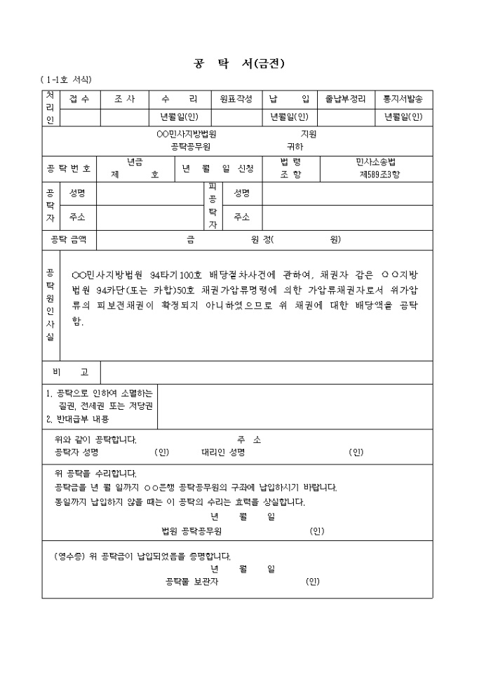 9,000원/월( 1-1호 서식) 가압류채권의배당액공탁서 입니다. OO민사지방법원 94타기100호 배당절차사건에 관하여 , 채권자 갑은 ○○지방법원 94카단(또는 카합)50호 채권가압류명령에 의한 가압류채권자로서 위가압류의 피보전채권이 확정되지 아니하였으므로 위 채권에 대한 배당액을 공탁함. ...