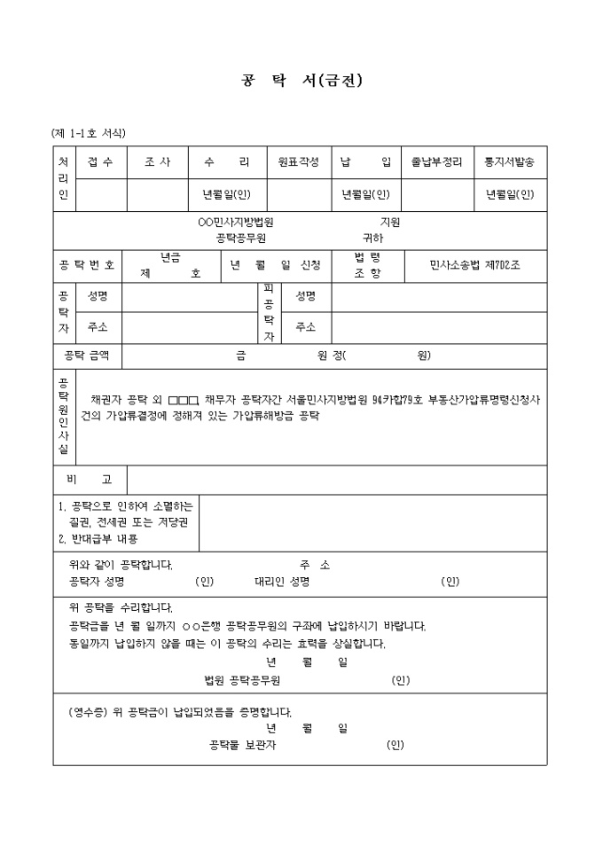 9,000원/월(제 1-1호 서식) 가압류해방금의공탁서 입니다. 채권자 공탁 외 □□□, 채무자 공탁자간 서울민사지방법원 94카합79호 부동산가압류명령신청사건의 가압류결정에 정해져 있는 가압류해방금 공탁 ...