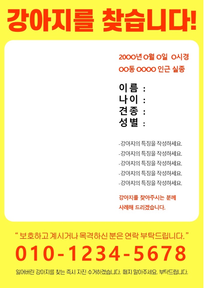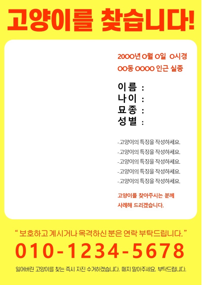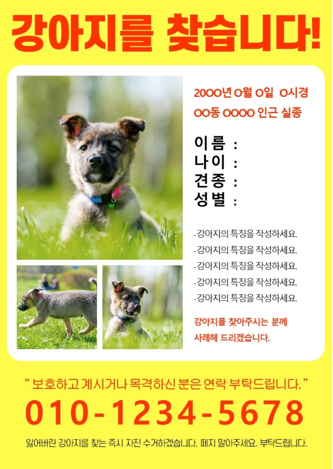 반려동물 실종 전단지 (강아지, 고양이, 사진 3장 삽입, 노란배경)