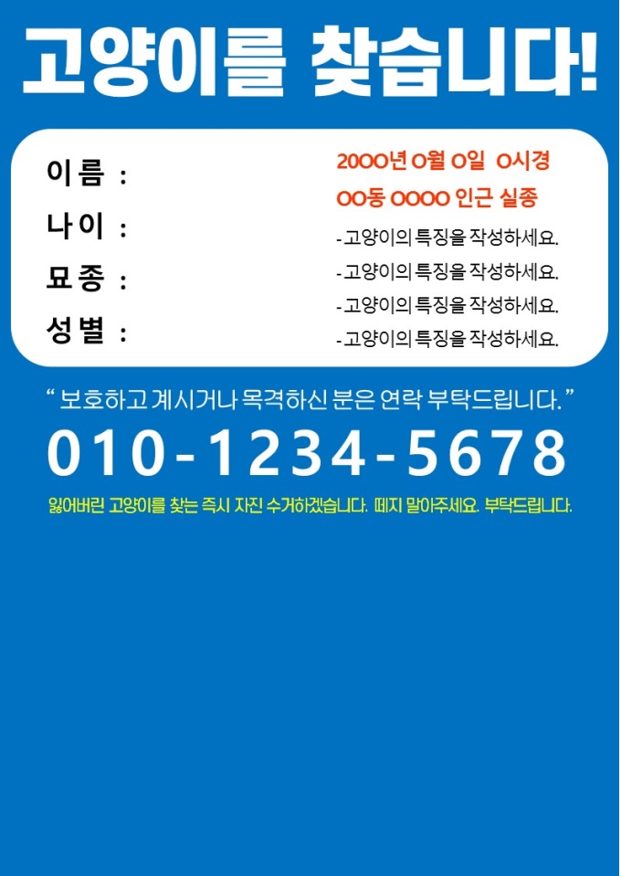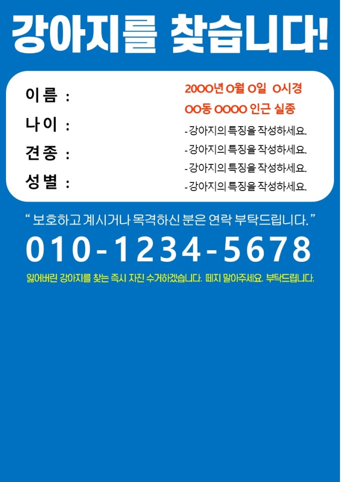 반려동물 실종 전단지 (강아지, 고양이, 사진 3장 삽입, 파란배경)