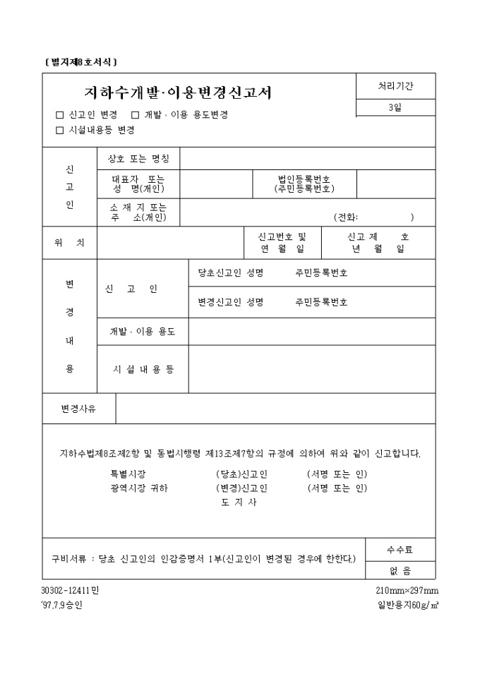 "지하수 개발, 이용변경 신고서(신고인 변경, 개발, 이용용도 변경, 시설내용등 변경)" 양식입니다.