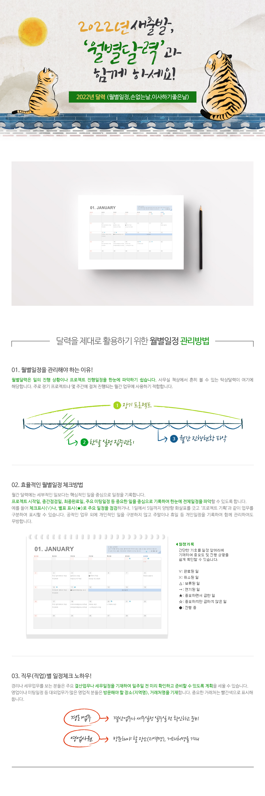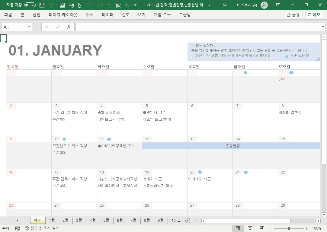 2022년 달력입니다. 모던한 디자인으로 월별일정 밎 이사할때 필수인 손없는 날을 월별로 확인하실 수 있도록 제작하였습니다.