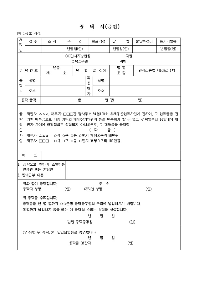 (제 1-1호 서식) 집달관이하는동산강제집행에따른매득금의공탁서 입니다. 채권자 △△△, 채무자 □□□간 당사무소 94본100호 유체동산압류사건에 관하여 , 그 압류물을 환가한 매득금으로 다음 기재의 배당참가채권자 등을 만족하게 할 수 없고, 경락일부터 14일내에 채권자 사 이에 배당협의도 성립되지 아니하므로, 그 매득금을 공탁함. ...