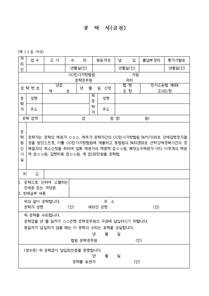 9,000원/월(제 1-1호 서식) 집행채권자등의채권액공탁서 입니다. 공탁자는 공탁의 채권자 ○○○, 채무자 공탁자간의 OO민사지방법원 94카기100호 강제집행정지결정을 받았으므로, 이를 OO민사지방법원에 제출하고 동법원의 94타경50호 선박강제경매사건의 경매절차의 취소신청을 위하여 압류 채권자의 채권액 금○○원, 배당요구채권자 어디 아무개의 채권액 금○○원, 집행비용 금○○원, 계 금100만원을 공탁함. ...
