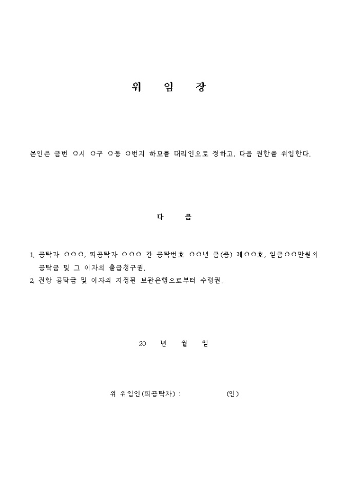 9,000원/월출급임의대리위임장 입니다. 1. 공탁자 ○○○, 피공탁자 ○○○ 간 공탁번호 ○○년 금(증) 제○○호, 일금○○만원의 공탁금 및 그 이자의 출급청구권. ..
