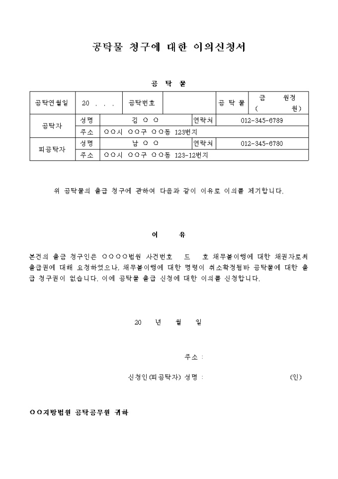 9,000원/월이의신청서(출급청구) 입니다. 위 공탁물의 출급(회수)청구에 관하여 는 다음과 같은 이유에 의하여 이의가 있으니 지급하지 마시기 바랍니다. ...