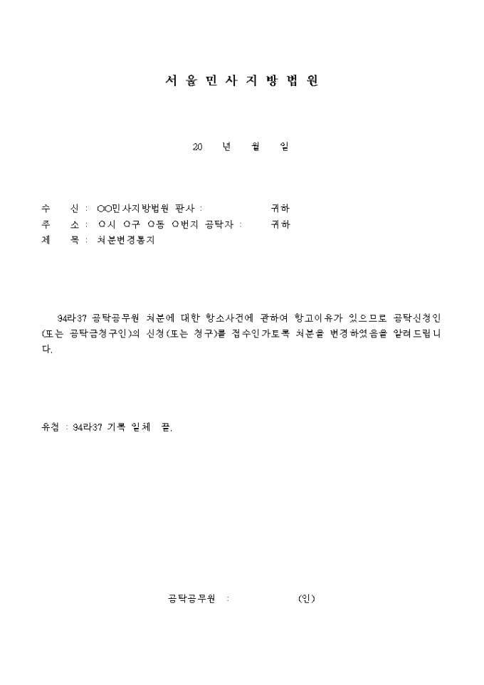 공탁공무원의처분변경통지 입니다. 94라37 공탁공무원 처분에 대한 항소사건에 관하여 항고이유가 있으므로 공탁신청인(또는 공탁금청구인)의 신청(또는 청구)를 접수인가토록 처분을 변경하였음을 알려드립니다. ...