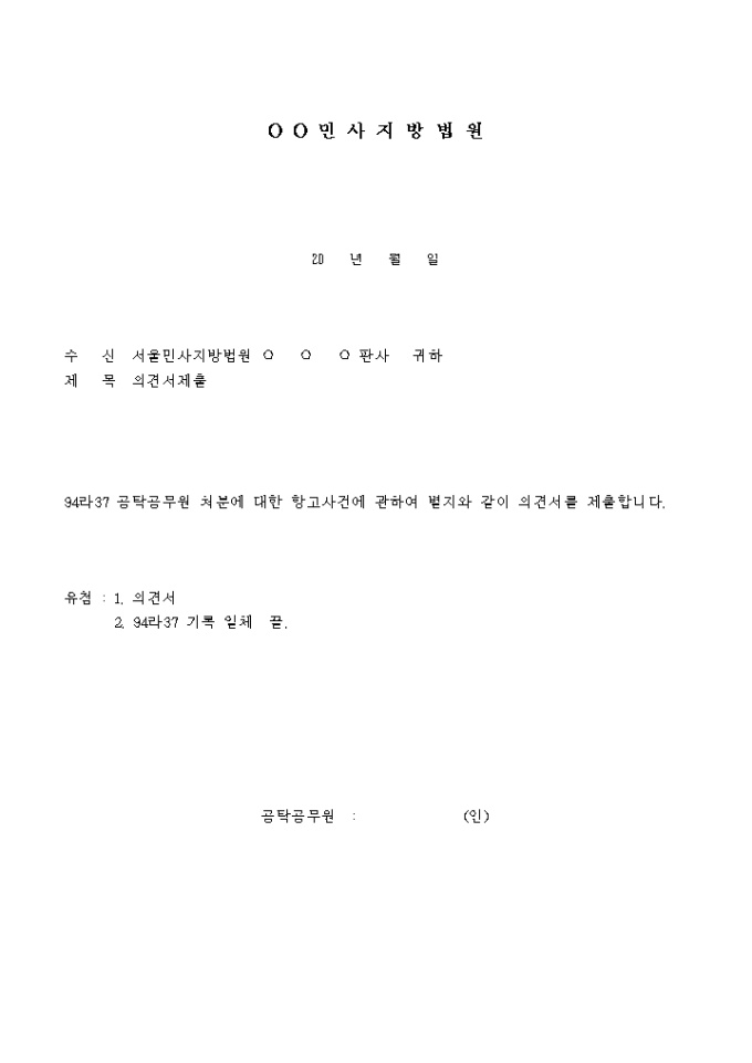 9,000원/월공탁공무원이판사에게보내는의견서 입니다. 94라37 공탁공무원 처분에 대한 항고사건에 관하여 별지와 같이 의견서를 제출합니다. ...