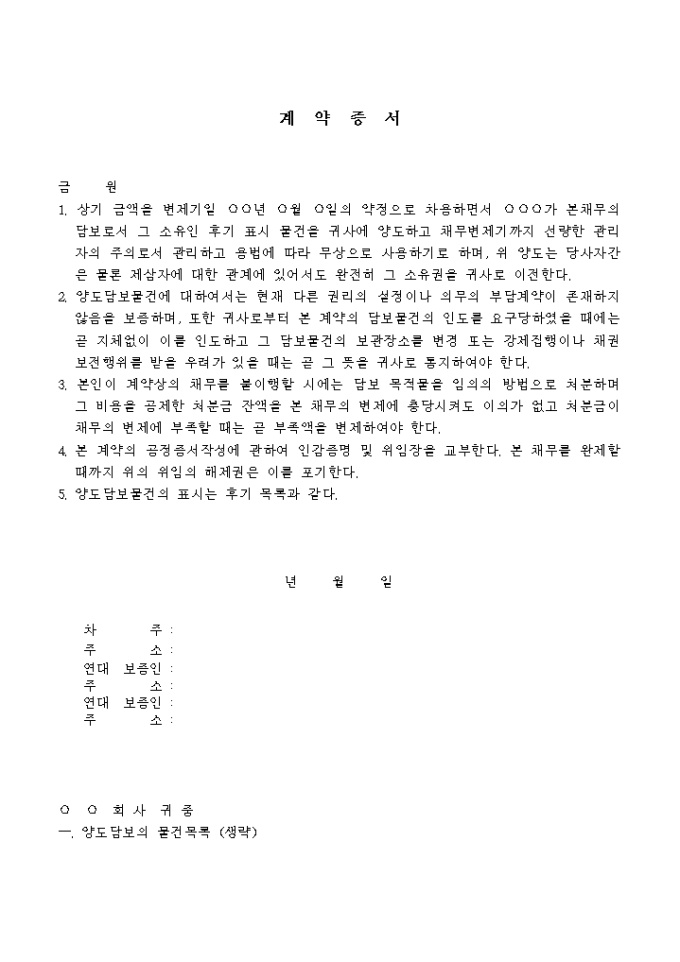 9,000원/월대여금채권을 위한 양도담보계약 양식입니다. 금 원 1. 상기 금액을 변제기일 년 월 일의 약정으로 차용하면서 가 본채무의 담보로서 그 소유인 후기 표시 물건을 귀사에 양도하고 채무변제기까지 선량한 관리자의 주의로서 관리하고 용법에 따라 무상으로 사용하기로 하며, 위 양도는 당사자간은 물론 제삼자에 대한 관계에 있어서도 완전히 그 소유권을 귀사로 이전한다. 2. 양도담보물건에 대하여 서는 현재 다른 권리의 설정이나 의무의 부담계약이