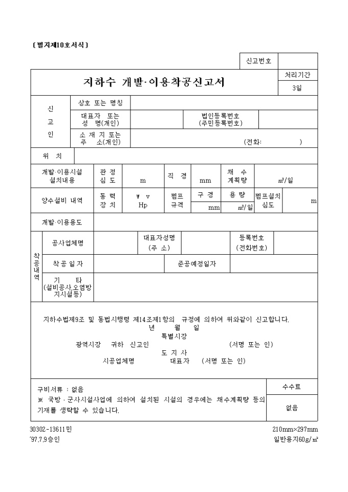 9,000원/월지하수법제9조 및 동법시행령 제14조제1항의 규정에 의하여 지하수 개발/이용 착공을 신고하고자 할 때 쓰이는 "지하수 개발, 이용 착공신고서" 양식입니다.