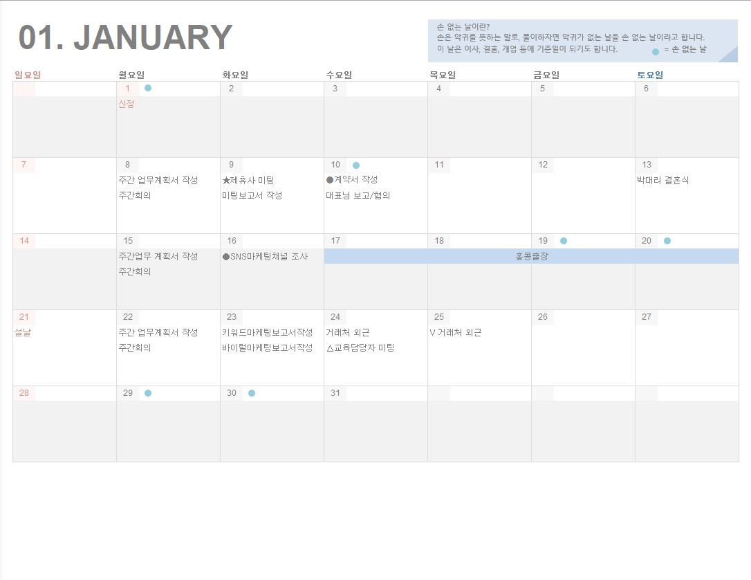 2024년 달력입니다. 모던한 디자인으로 월별 일정 밎 이사할 때 필수인 손 없는 날을 월별로 확인하실 수 있도록 제작하였습니다.