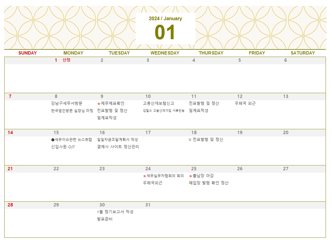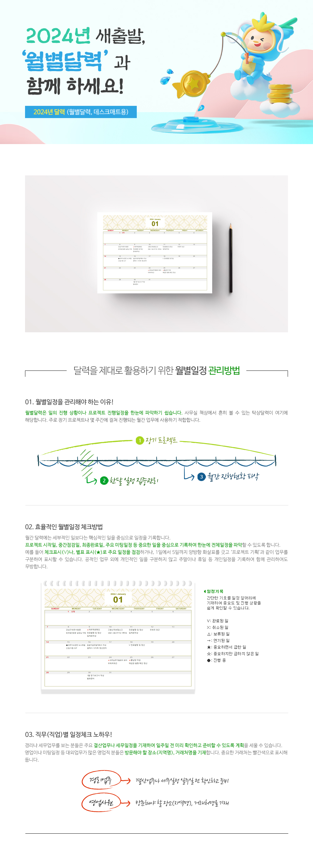 2024년 달력입니다. 월별로 다양한 디자인을 활용하여 제작하였습니다.