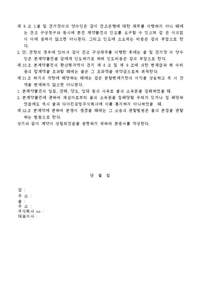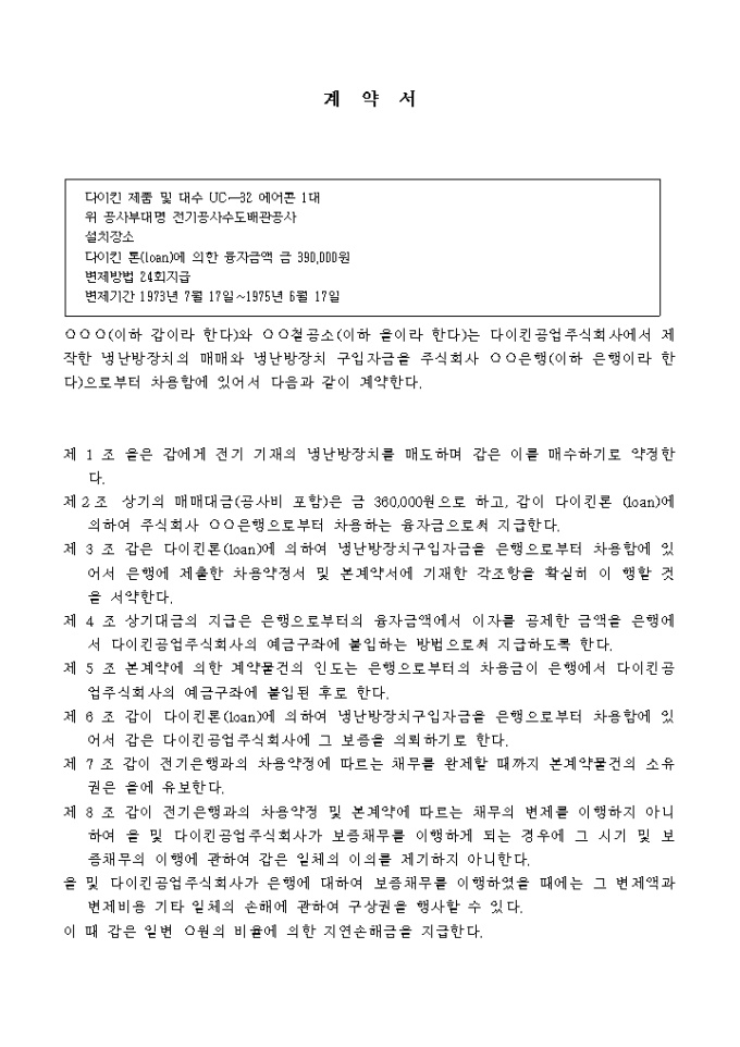 9,000원/월차주와냉방장치공사청부인과의보증위탁계약 양식입니다. 제 1 조 을은 갑에게 전기 기재의 냉난방장치를 매도하며 갑은 이를 매수하기로 약정한다. 제 2 조 상기의 매매대금(공사비 포함)은 금 360, 000원으로 하고, 갑이 다이킨론 (loan)에 의하여 주식회사 은행으로 부터 차용하는 융자금으로 써 지급한다. 제 3 조 갑은 다이킨론(loan)에 의하여 냉난방장치구입자금을 은행으로 부터 차용함에 있어서 은행에 제출한 차용약정서 및 본계약서에 기재한 각