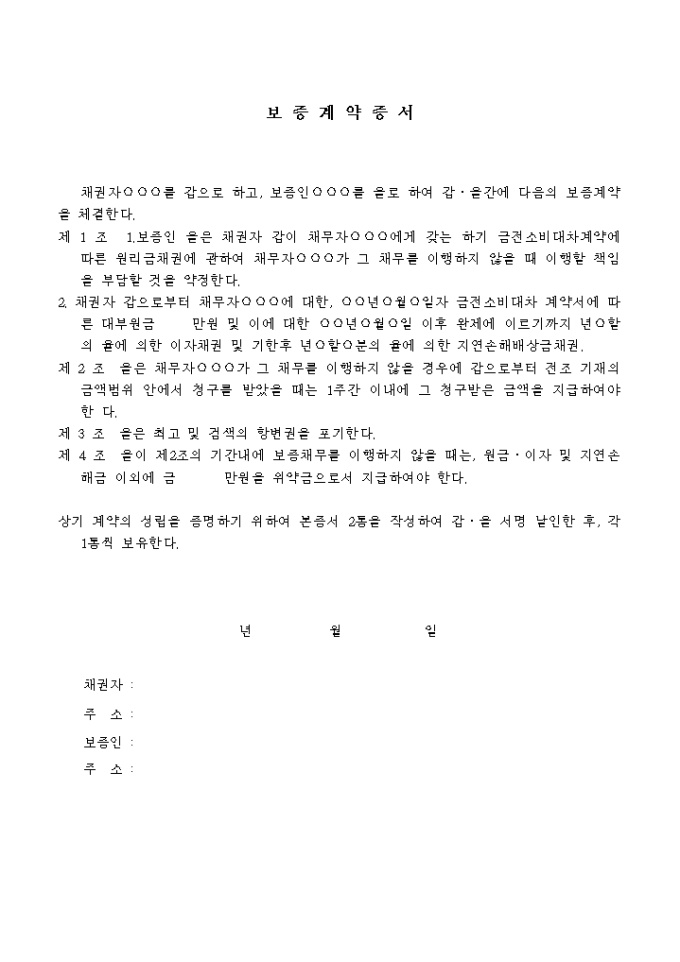 9,000원/월보증계약증서 예제 양식입니다. 제 1 조 1.보증인 을은 채권자 갑이 채무자 에게 갖는 하기 금전소비대차계약에 따른 원리금채권에 관하여 채무자 가 그 채무를 이행하지 않을 때 이행할 책임을 부담할 것을 약정한다. 2. 채권자 갑으로 부터 채무자 에 대한 , 년 월 일자 금전소비대차 계약서에 따른 대부원금 만원 및 이에 대한 년 월 일 이후 완제에 이르기까지 년 할의 율에 의한 이자채권 및 기한후 년 할 분의 율에 의한 지연손