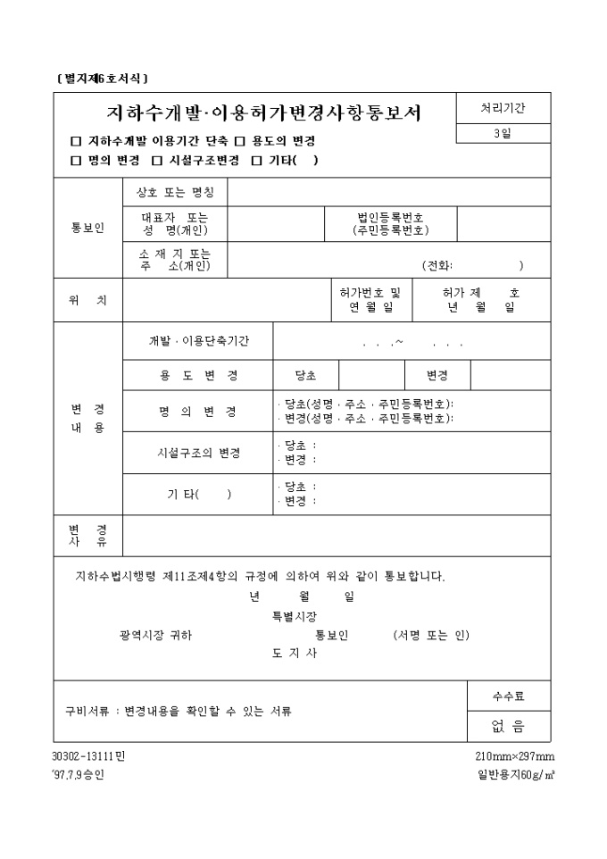 지하수개발, 이용허가변경사항통보서(지하수개발이용기간단축, 용도의변경, 기타)