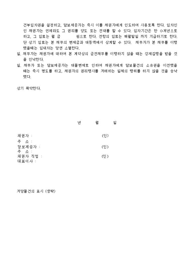 추가담보로근저당을설정한계약 예제 양식입니다. 년 월 일자 제 1 번 저당권 설정계약 금전채무 변제계약에 따라 년 월 일 등기소 접수 제 호로서 등기한 하기 저당권에 대하여, 말미기재의 물건을 추가담보로 하여 제1번 순위의 저당권설정을 승낙한다. 일. 등기한 저당권의 표시 채권액 금 원 변제기 및 변제방법 년 월 일 부터 년 월 일 까지 매월 1회 금 원씩