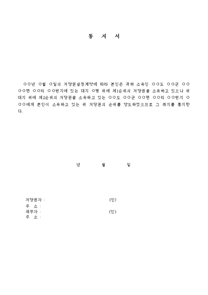 9,000원/월저당권순위양도통지서 예제 양식입니다. ○○년 ○월 ○일의 저당권설정계약에 따라 본인은 귀하 소유인 ○○도 ○○군 ○○○○면 ○○리 ○○번지에 있는 대지 ○평 위에 제1순위의 저당권을 소유하고 있으나 위 대지 위에 제2순위의 저당권을 소유하고 있는 ○○도 ○○군 ○○면 ○○리 ○○번지 ○○○에게 본인이 소유하고 있는 위 저당권의 순위를 양도하였으므로 그 취지를 통지한다. ...