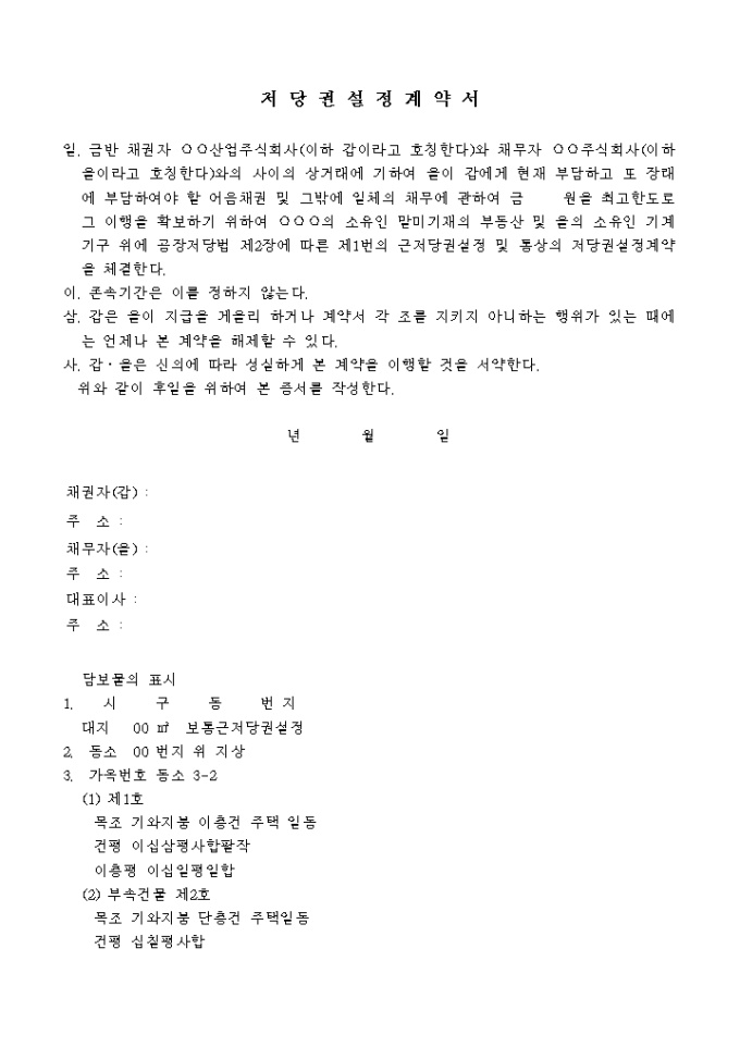 9,000원/월공장저당및통상의근저당권설정계약 예제 양식입니다. 일. 금반 채권자 ○○산업주식회사(이하 갑이라고 호칭한다)와 채무자 ○○주식회사(이하 을이라고 호칭한다)와의 사이의 상거래에 기하여 을이 갑에게 현재 부담하고 또 장래에 부담하여야 할 어음채권 및 그밖에 일체의 채무에 관하여 금 원을 최고한도로 그 이행을 확보하기 위하여 ○○○의 소유인 말미기재의 부동산 및 을의 소유인 기계 기구 위에 공장저당법 제2장에 따른 제1번의 근저당권설정 및 통상의 저당권설정계약을 체결한다. 이. 존속기간은 이를 정하지 않는다. 삼. 갑은 을이 지급을 게을리 하거나 계약서 각 조를 지키지 아니하는 행위가 있는 때에는 언제나 본 계약을 해제할 수 있다. ...