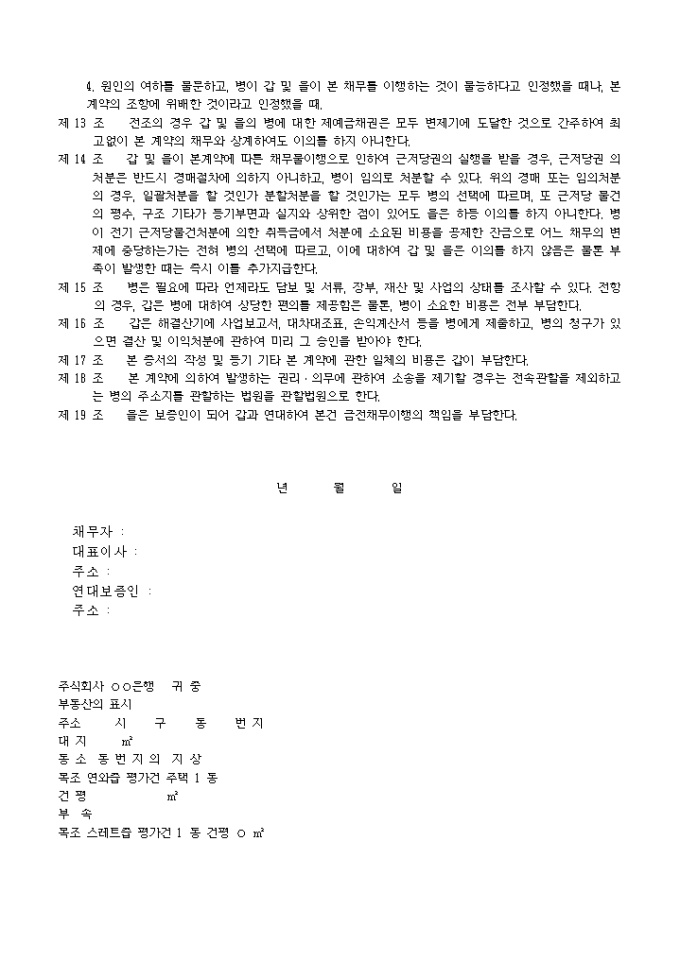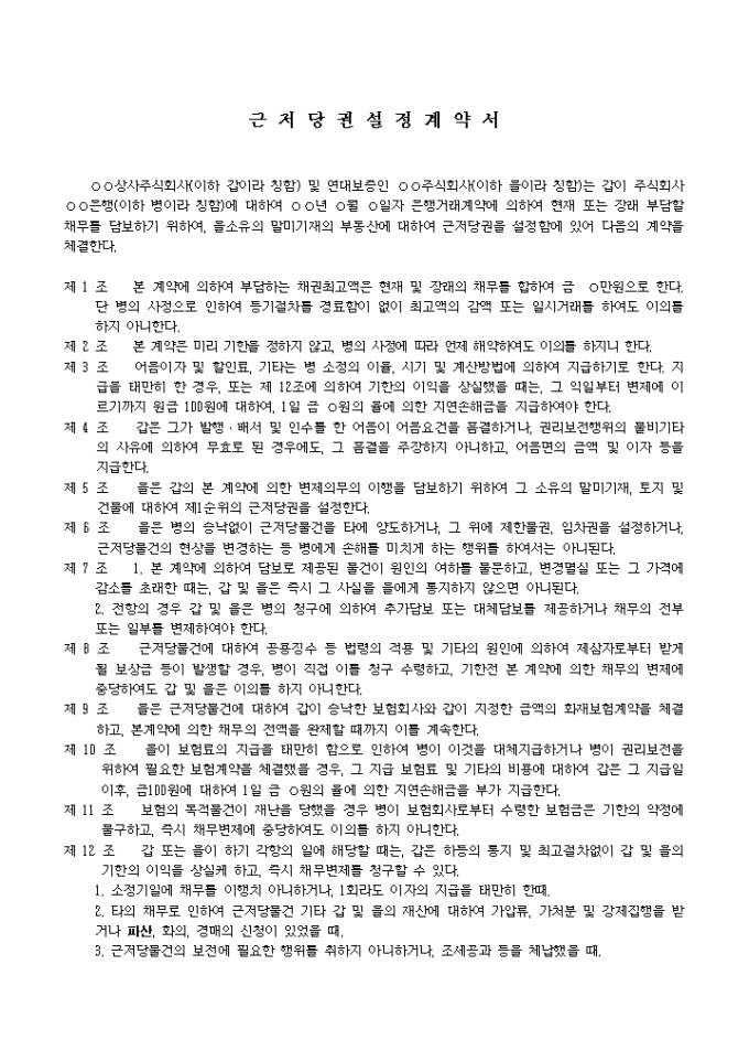9,000원/월대출의공통담보를목적으로한근저당권설정계약 예제 양식입니다. 상사주식회사(이하 갑이라 칭함) 및 연대보증인 주식회사(이하 을이라 칭함)는 갑이 주식회사 은행(이하 병이라 칭함)에 대하여 년 월 일자 은행거래계약에 의하여 현재 또는 장래 부담할 채무를 담보하기 위하여, 을소유의 말미기재의 부동산에 대하여 근저당권을 설정함에 있어 다음의 계약을 체결한다. 제 1 조 본 계약에 의하여 부담하는 채권최고액은 현재 및 장래의 채무를