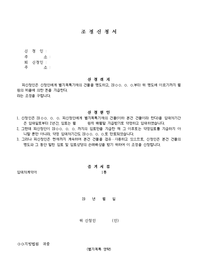 피신청인은 신청인에게 별지목록기재의 건물을 명도하고, ...일부터 위 명도에 이르기까지 월...원의 비율에 의한 돈을 지급하라는 판결의 조정을 구하는 내용입니다.