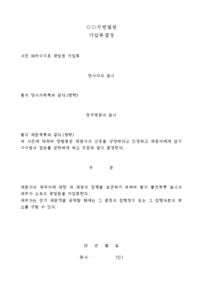 9,000원/월권자의 채무자에 대한 위 채권의 집행을 보전하기 위하여 별지 물건목록 표시의 채무자 소유의 광업권을 가압류한다라는 내용의 결정서입니다.