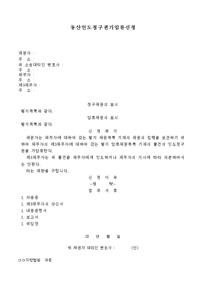 9,000원/월채권자는 채무자에 대하여 갖는 별지 채권목록 기재의 채권의 집행을 보전하기 위하여 채무자의 제3채무자에 대하여 갖는 별지 압류채권목록 기재의 물건의 인도청구권을 가압류하며 제3채무자는 위 물건을 채무자에게 인도하거나 채무자의 지시에 따라 처분하여 서는 안된다라는 재판을 구하는 소장입니다.