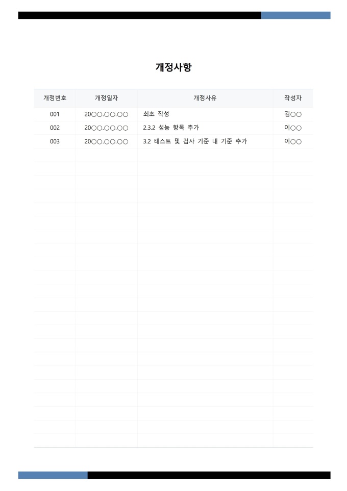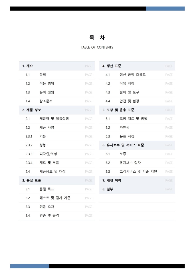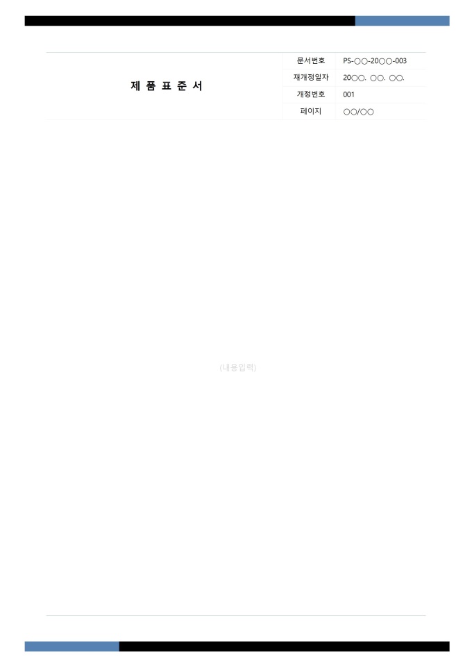 제품표준서 서식입니다. 제품표준서 서식은 제품의 제조 과정 및 품질 기준을 명확하게 정의하고 관리하기 위한 핵심 문서입니다. 제품의 사양, 구성 요소, 제조 공정, 검사 기준 등 모든 생산 관련 정보를 상세히 기록하여 품질 일관성을 유지합니다. 본 서식은 제품표준서 표지, 목차, 세부내용 입력 페이지, 개정사항 등 총 4페이지로 구성되어 있습니다.