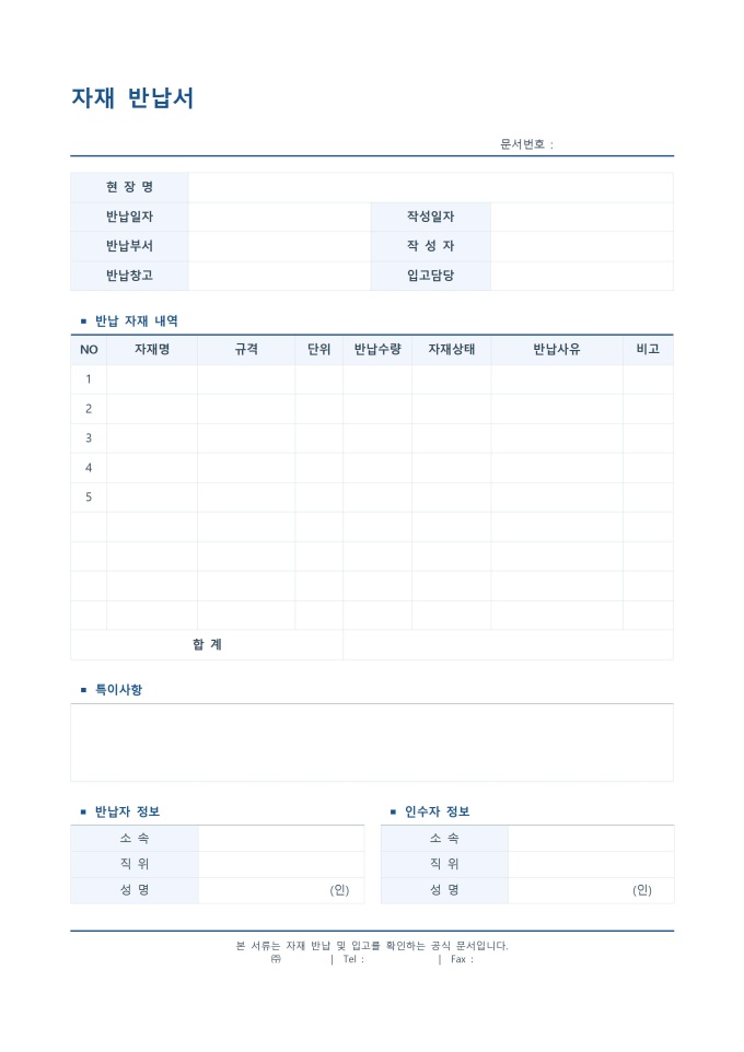 9,000원/월자재 반납서 서식입니다.자재 반납서는 현장이나 부서에서 사용 후 남거나 불필요해진 자재를 창고 등으로 반납할 때 사용되는 문서입니다. 반납하는 자재의 명칭, 수량, 반납 사유, 반납자 및 인수자 정보 등을 명확히 기록하여 자재의 입출고 과정을 투명하게 관리하고 재고 파악의 정확성을 높이는 데 기여합니다.